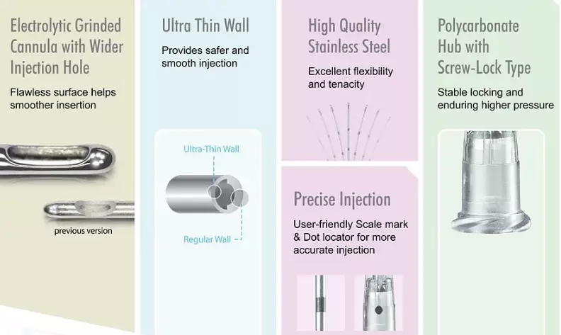 カニューレは鈍いため、静脈や動脈を突き刺す可能性が低くなります。これにより、腫れ、打撲傷、フィラーの血管内注入が軽減されます。施術者は、どのような構造がカニューレの先端を通過しているのかをより正確に把握できます。